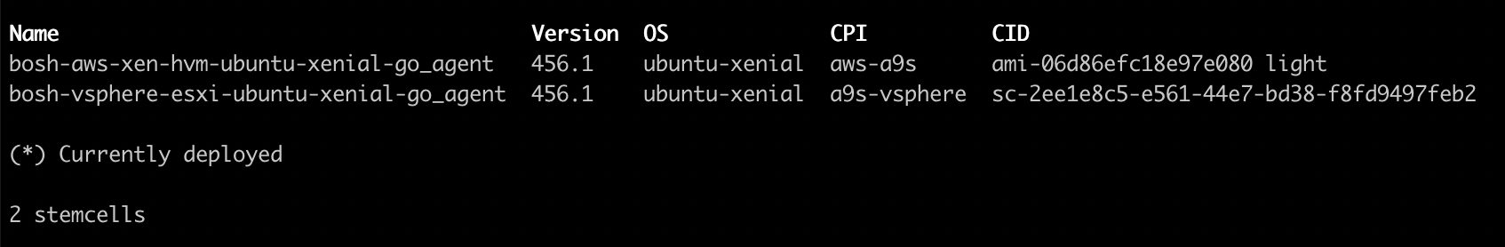 region: <span class="token variable"><span class="token punctuation">((</span>region<span class="token punctuation">))</span></span>One important step to mention here is that after you uploaded the CPI config you need to re-upload the stemcells for the different CPIs. After this was done the output of bosh stemcells look like the following: