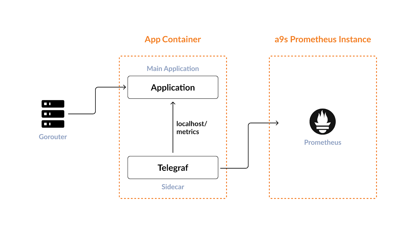 For the sidecar, this example uses the telegraf-buildpack. It includes Telegraf which is a plugin-driven server agent for collecting and sending metrics. It is coupled to your application, scraps the metrics endpoint, and forwards them to a configured Graphite Exporter endpoint. In addition to the application metrics, the telegraf-buildpack is configured to let Telegraf also forward the system metrics from your application container. Collecting system metrics is a separate topic that is worth discussing. I recommend checking out this video.