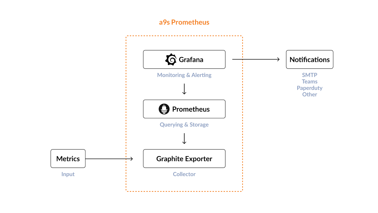 The Prometheus service is the a9s Prometheus which contains Prometheus, the Prometheus Alertmanager, a Graphite Exporter and also a Grafana dashboard connected to Prometheus.