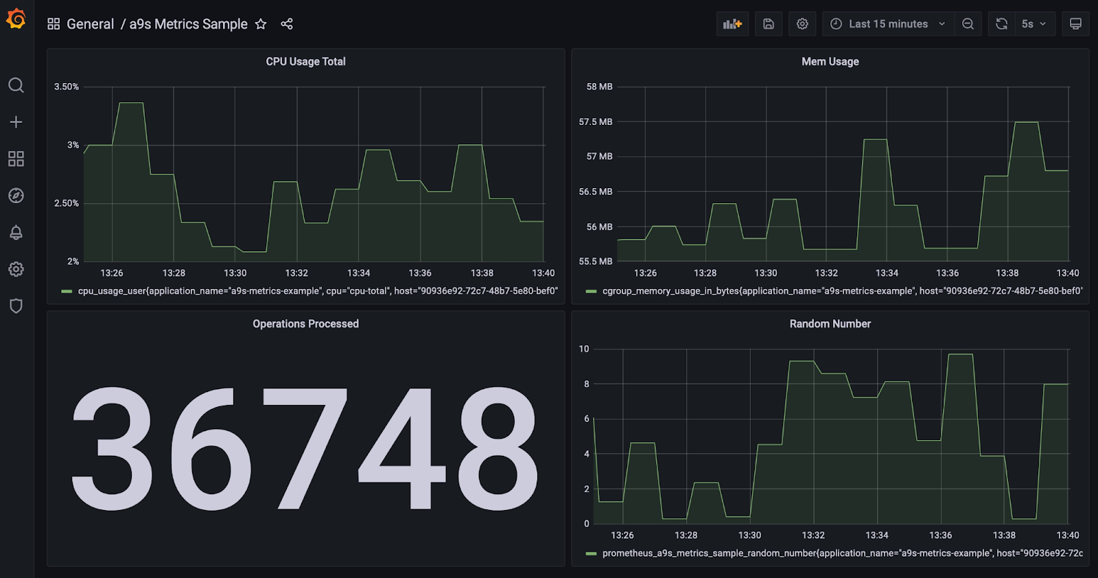 When the application is pushed, we can open the Grafana dashboard in our service instance and use the example dashboard provided in the repository to see the metrics. Just copy the JSON data into a new dashboard.